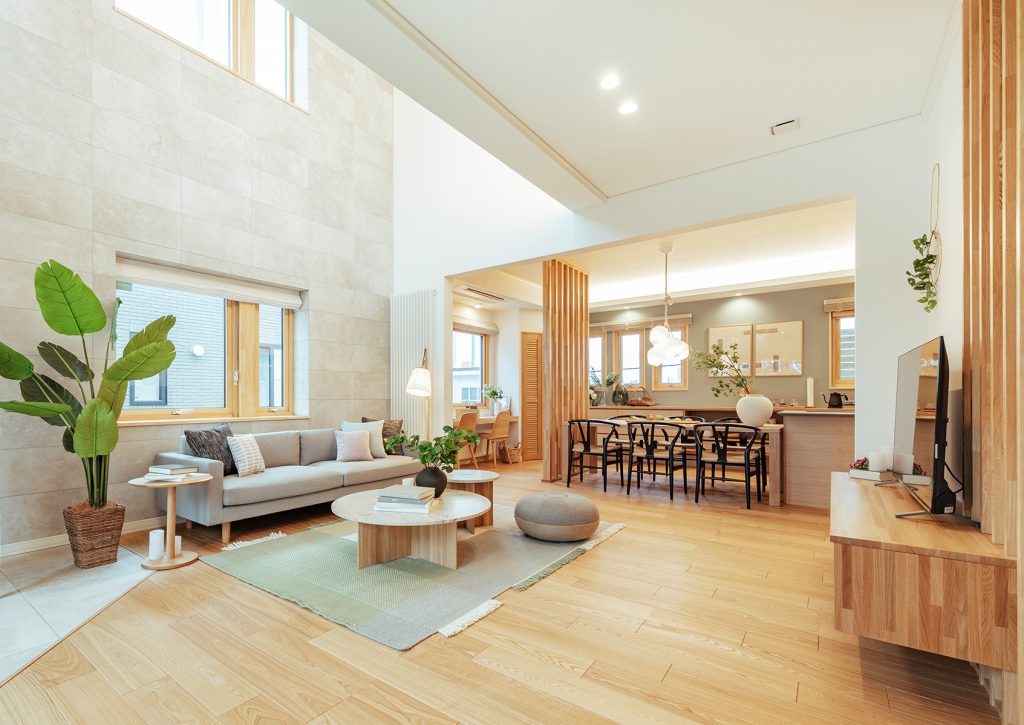 2階の窓から降り注ぐたっぷりの自然光がリビングいっぱいに広がり、季節の移ろいを感じながら、毎日を明るく照らします。